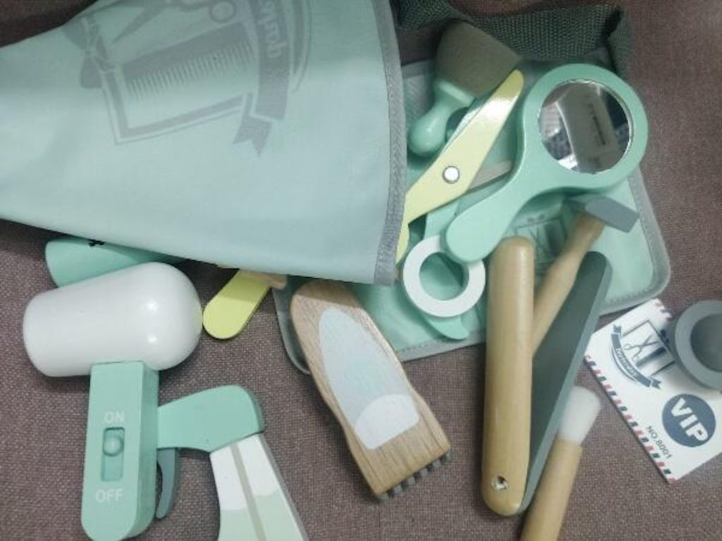 How can role play toys like wooden barber toy prepare children for real-life grooming skills?